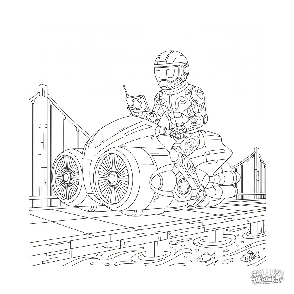 Сложная раскраска для детей 10-12 лет: футуристический ховербайк патрулирует мост над рекой. Технические детали и чистые линии понравятся юным любителям науки и техники.