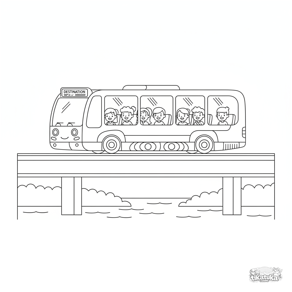 Раскраска для мальчиков 7-9 лет: футуристический летающий автобус плавно движется по специальной полосе на мосту над рекой. Современный плоский дизайн, чистые линии, интересная концепция.