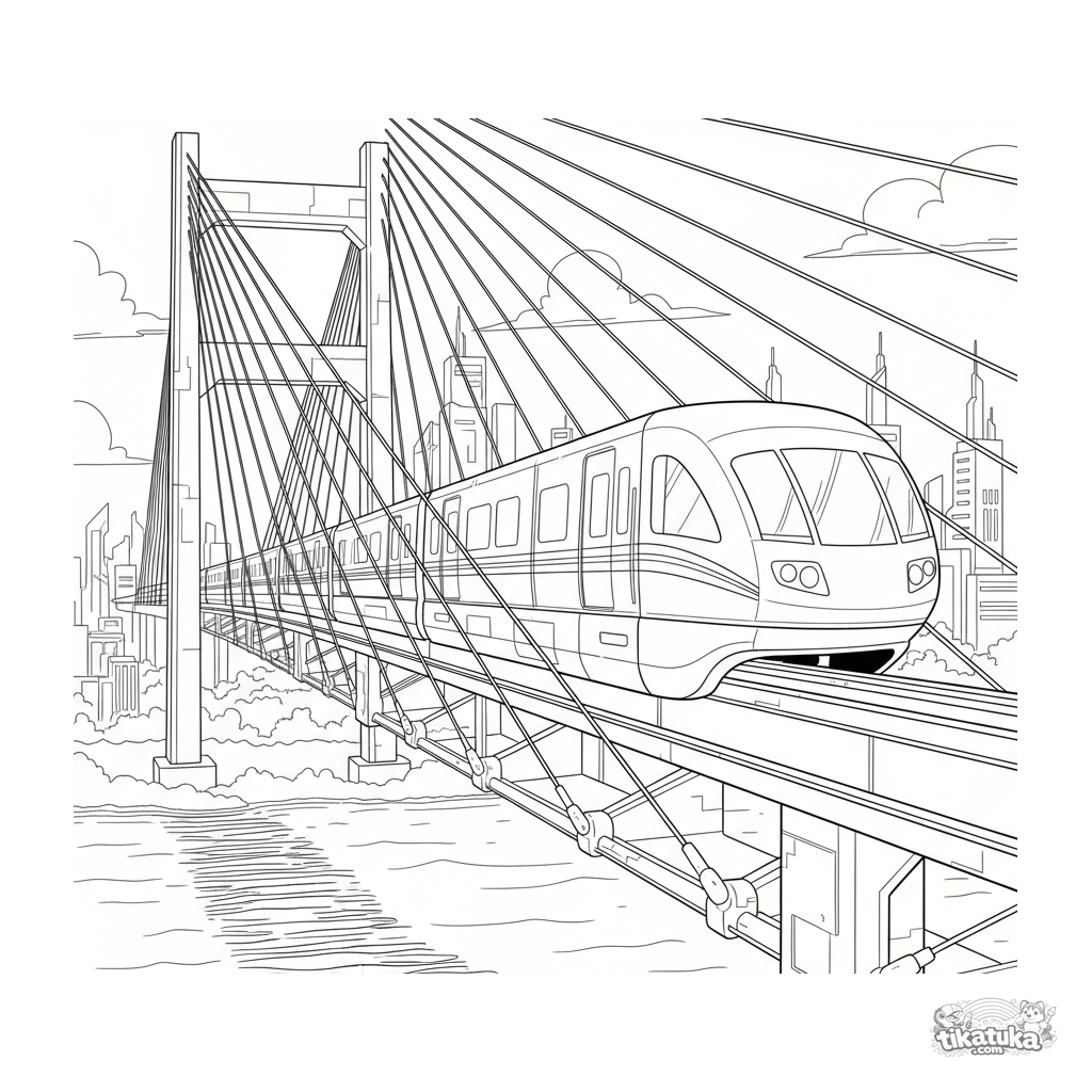 Раскраска футуристического монорельса на подвесном мосту над рекой. Для детей 10-12 лет. Технические детали, динамичная композиция.