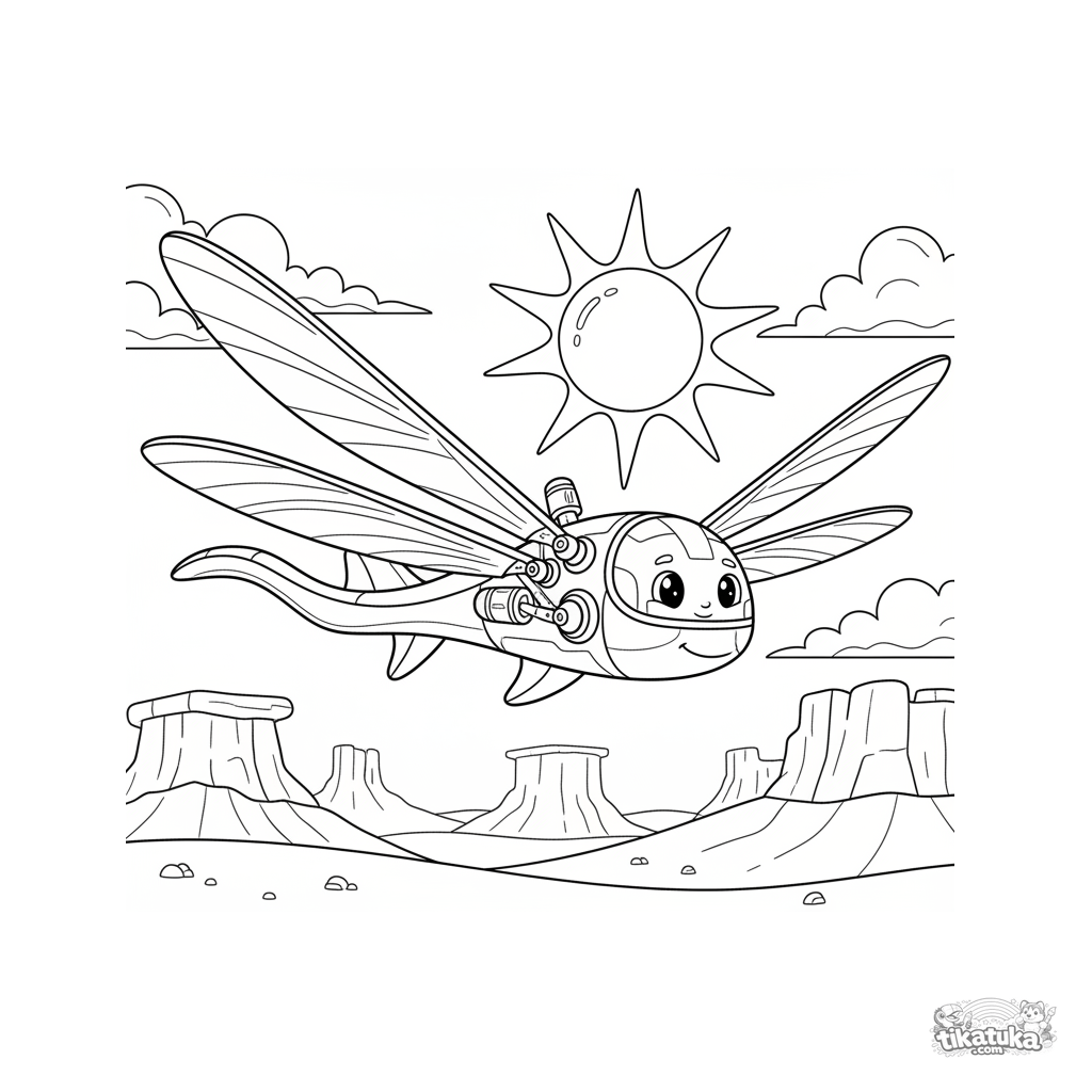 Фантастическая раскраска орнитоптера — летательного аппарата с машущими крыльями, парящего над пустыней. Для детей 4-6 лет. Интересные механические детали.