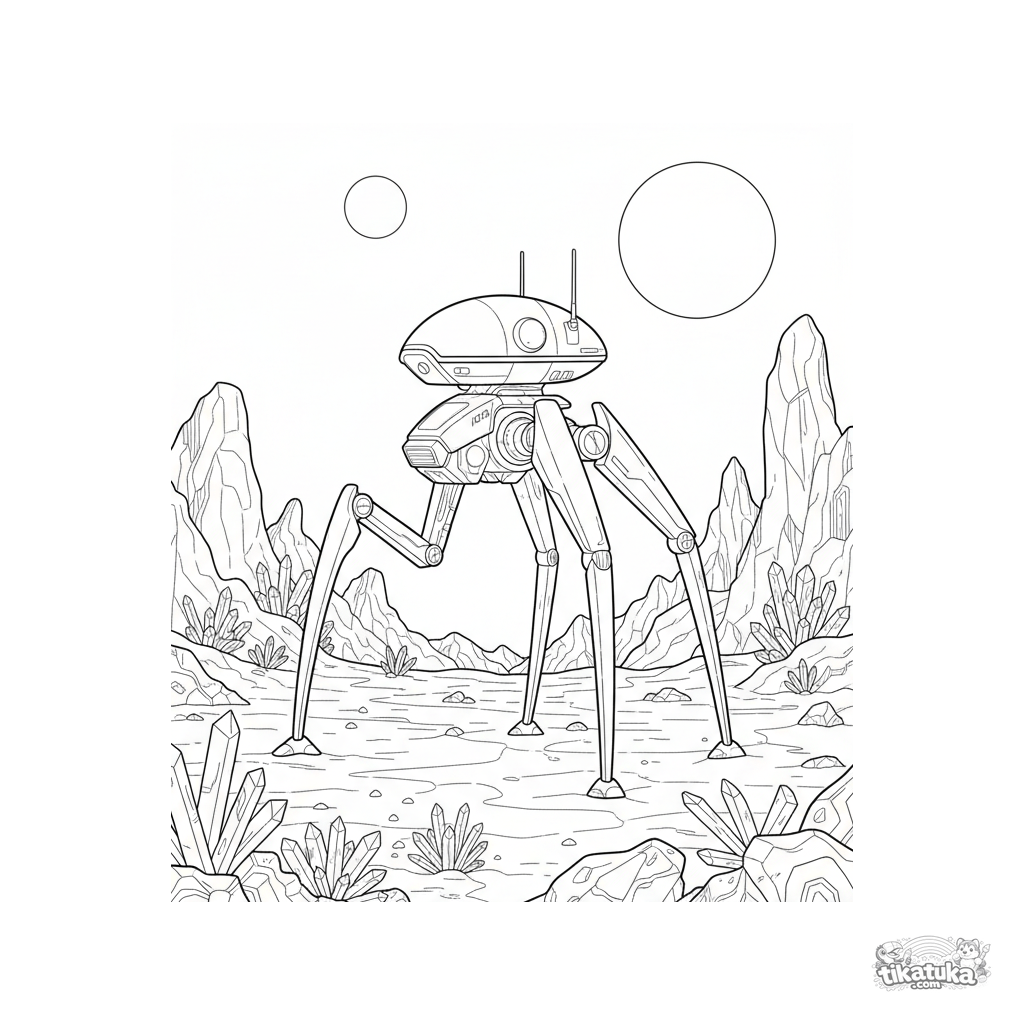Раскраска для детей постарше: футуристический разведывательный ходок на четырёх ногах исследует скалистую инопланетную равнину. Для возраста 7-12 лет.