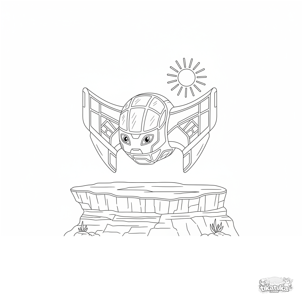 Раскраска для детей 10-12 лет: футуристический летательный аппарат парит над пустынным плато. Чистая геометрия, минималистичный дизайн.
