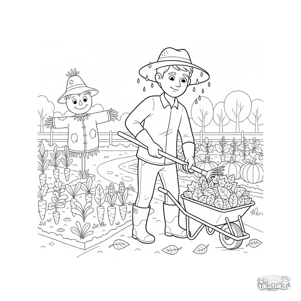 Раскраска для детей 7-9 лет: садовник в сапогах и шляпе собирает мокрые листья в тачку на осенней дорожке. Детализированные инструменты и осенняя атмосфера.