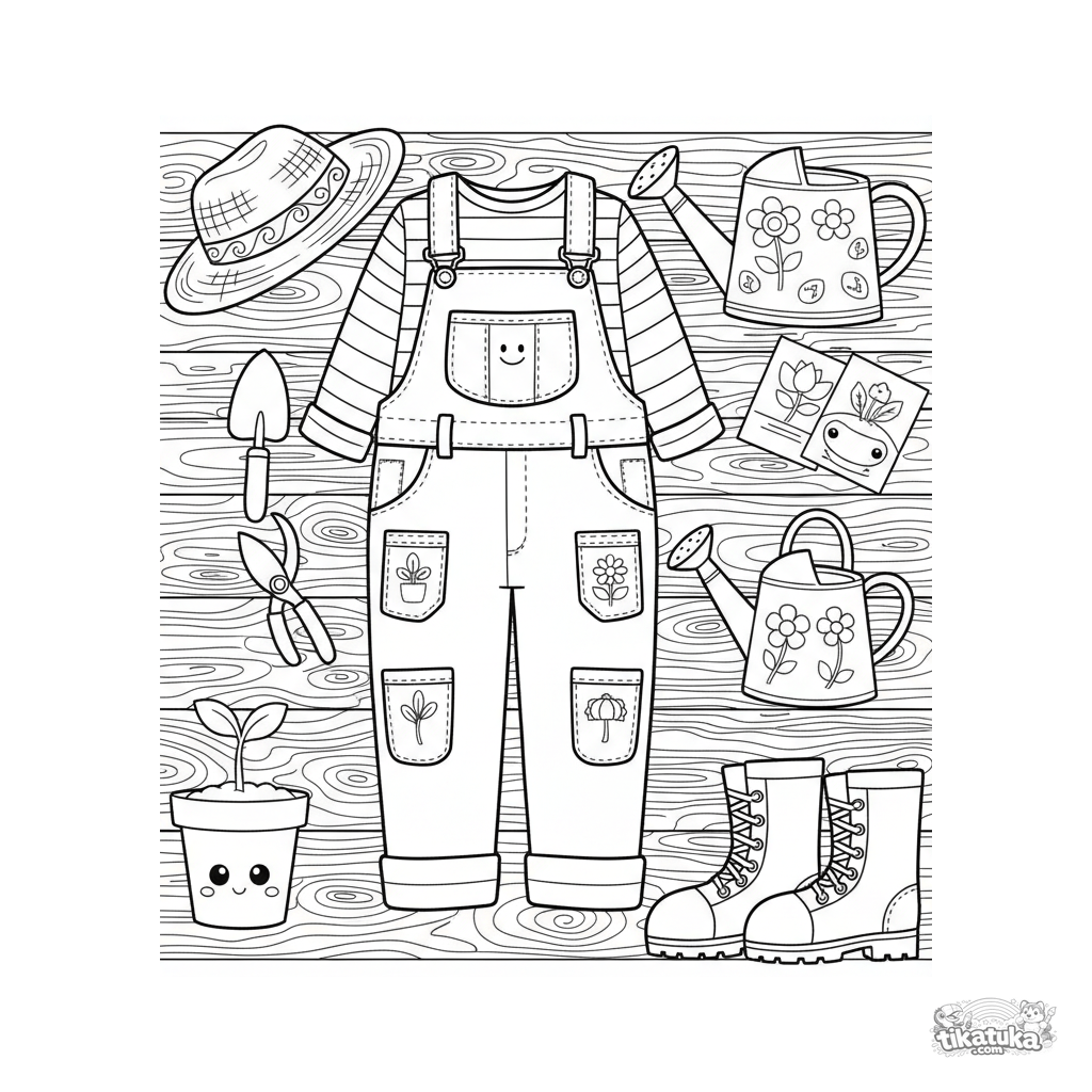 Раскраска в скетчбук-стиле для детей 10-12 лет: детализированный комплект садовой одежды и инструментов, разложенный на деревянной поверхности. Много карманов, текстур и мелких предметов.