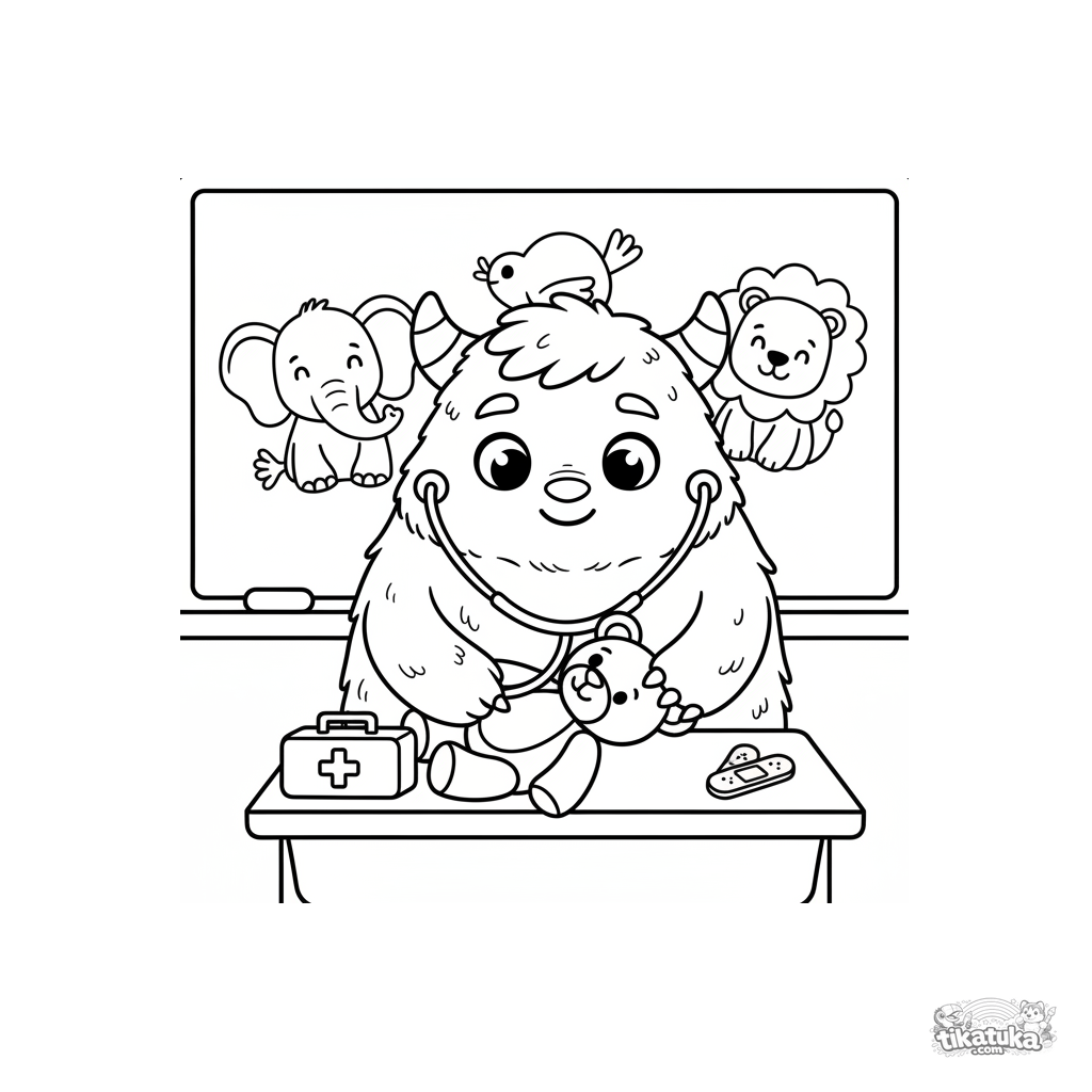 Простая раскраска для малышей 2-3 года: большой добрый монстр-ветеринар в стетоскопе осматривает плюшевого мишку на парте. Огромные мягкие формы, очень мало деталей.