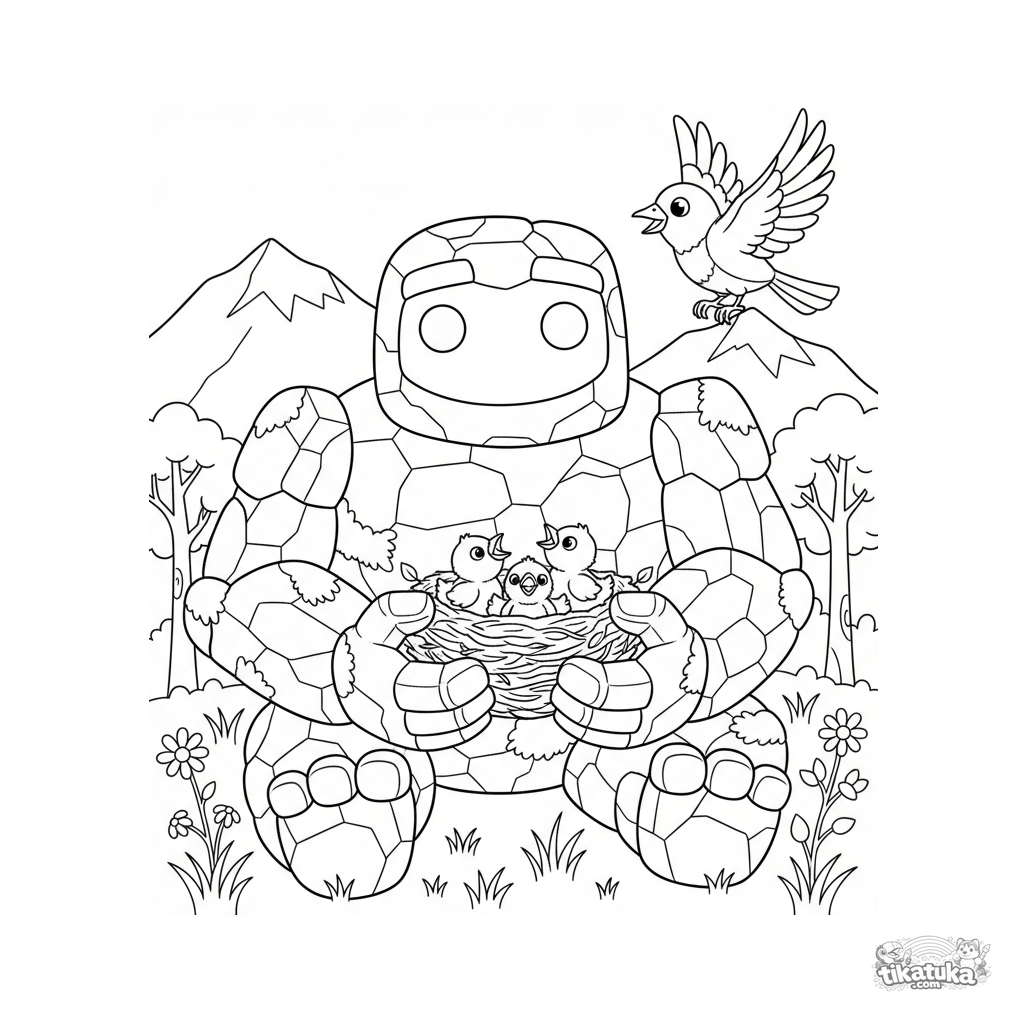 Раскраска для детей 7-9 лет: огромный, но добрый каменный голем сидит в горном лугу, осторожно держа в руках птичье гнездо с птенцами. Трогательная фэнтези-сцена.