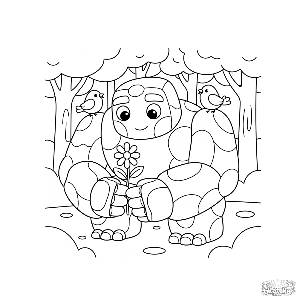 Простая раскраска для малышей 2-3 лет: большой добрый каменный голем в лесу аккуратно держит маленький цветок. Крупные формы, мало деталей, для первого творчества.