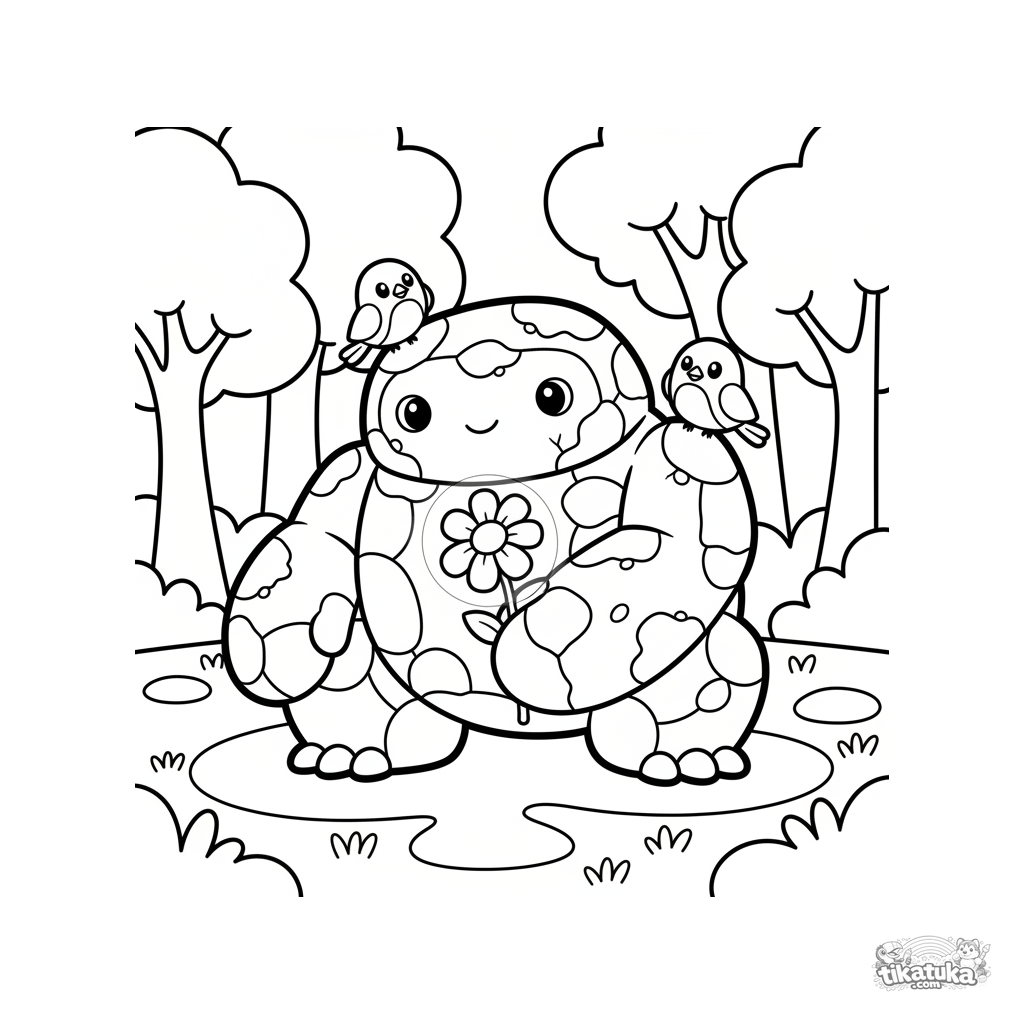 Простая раскраска для малышей 2-3 лет: большой добрый голем из камня сидит на лугу и осторожно держит в руке один светящийся цветок.