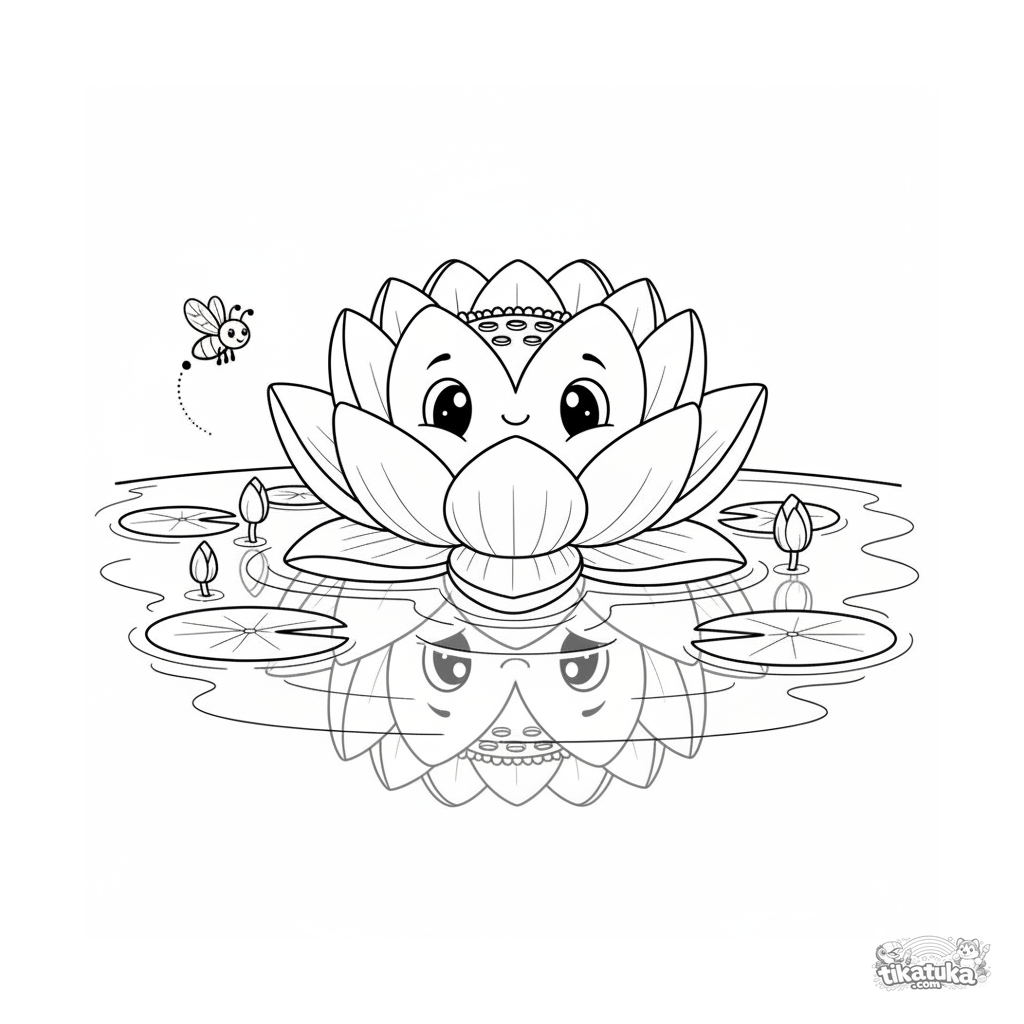 Раскраска для детей 7-9 лет: гигантский цветок лотоса плывет по лунному пруду. Волшебная ночная сцена с отражением и светлячком.