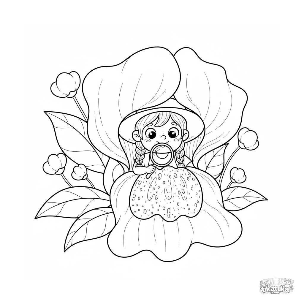 Раскраска для детей 7-9 лет: ребенок исследует гигантский цветок львиного зева. Сцена в саду, полная деталей для творческого раскрашивания.