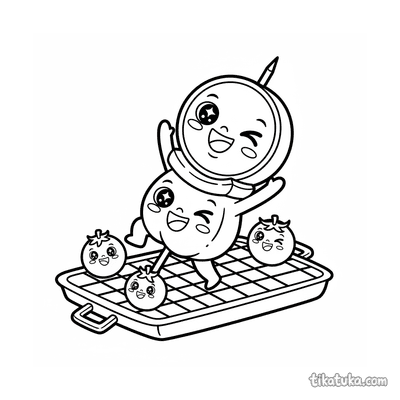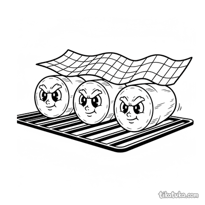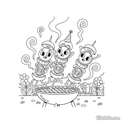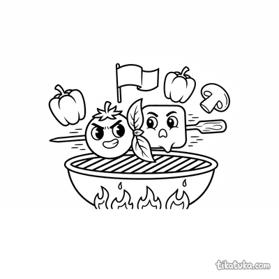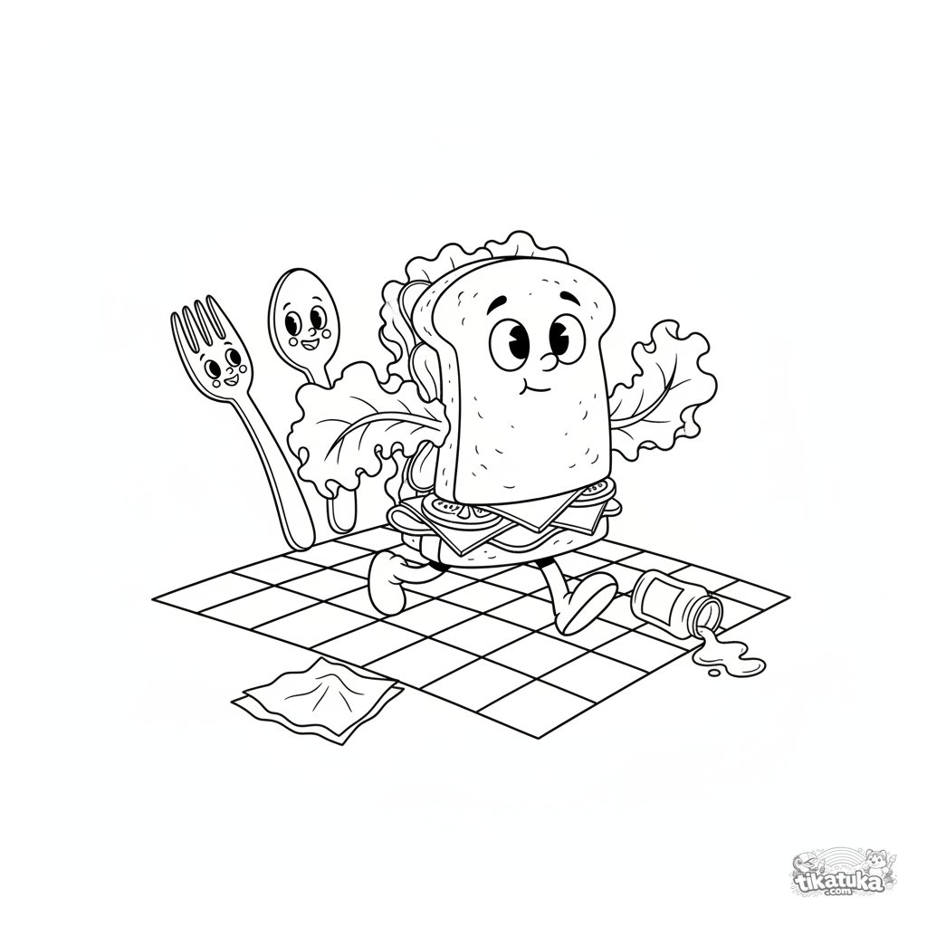 Веселая раскраска: гигантский бутерброд убегает от столовых приборов. Для детей 4-6 лет. Забавная сцена с едой, развивающая воображение.