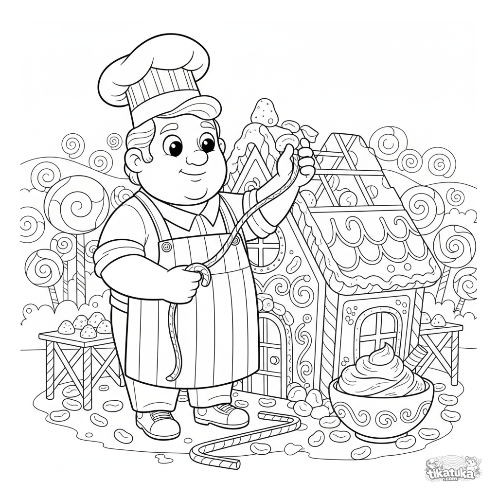 Сложная раскраска по сказке: строитель из конфет возводит пряничный домик. Для детей 8-12 лет. Детали: леденцовые леса, миска с глазурью, желейные кирпичики.