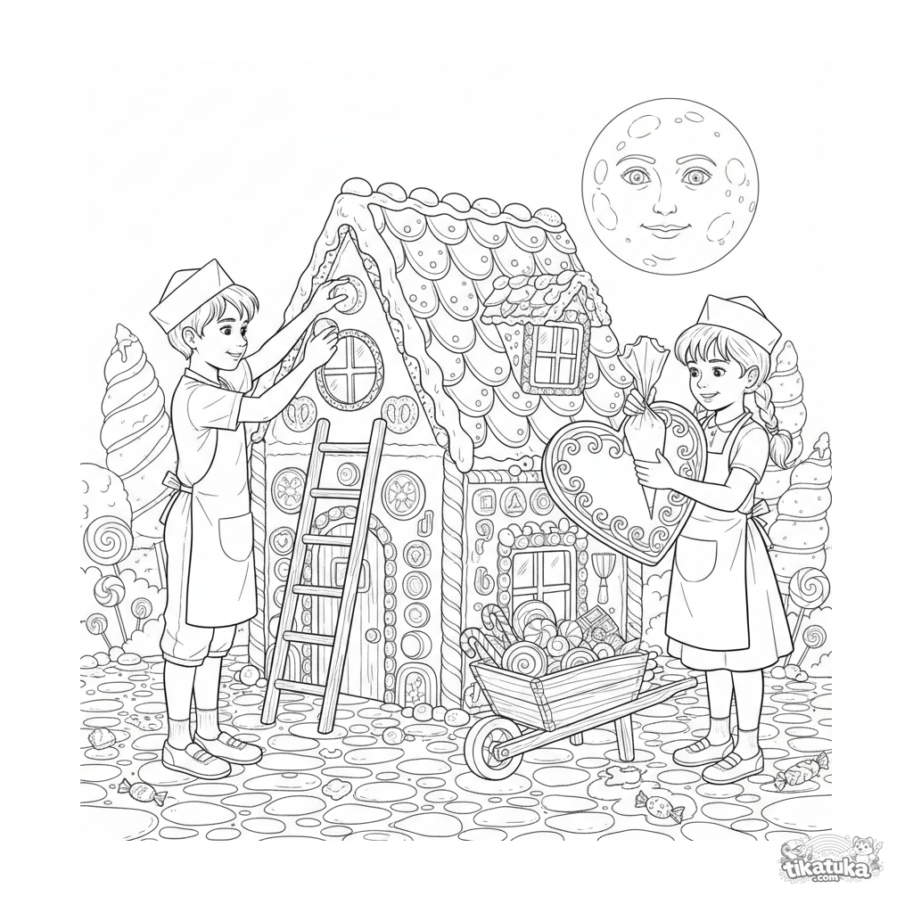 Раскраска по сказке: Гензель и Гретель строят свой знаменитый пряничный домик, украшая его конфетами. Для детей 6-9 лет.
