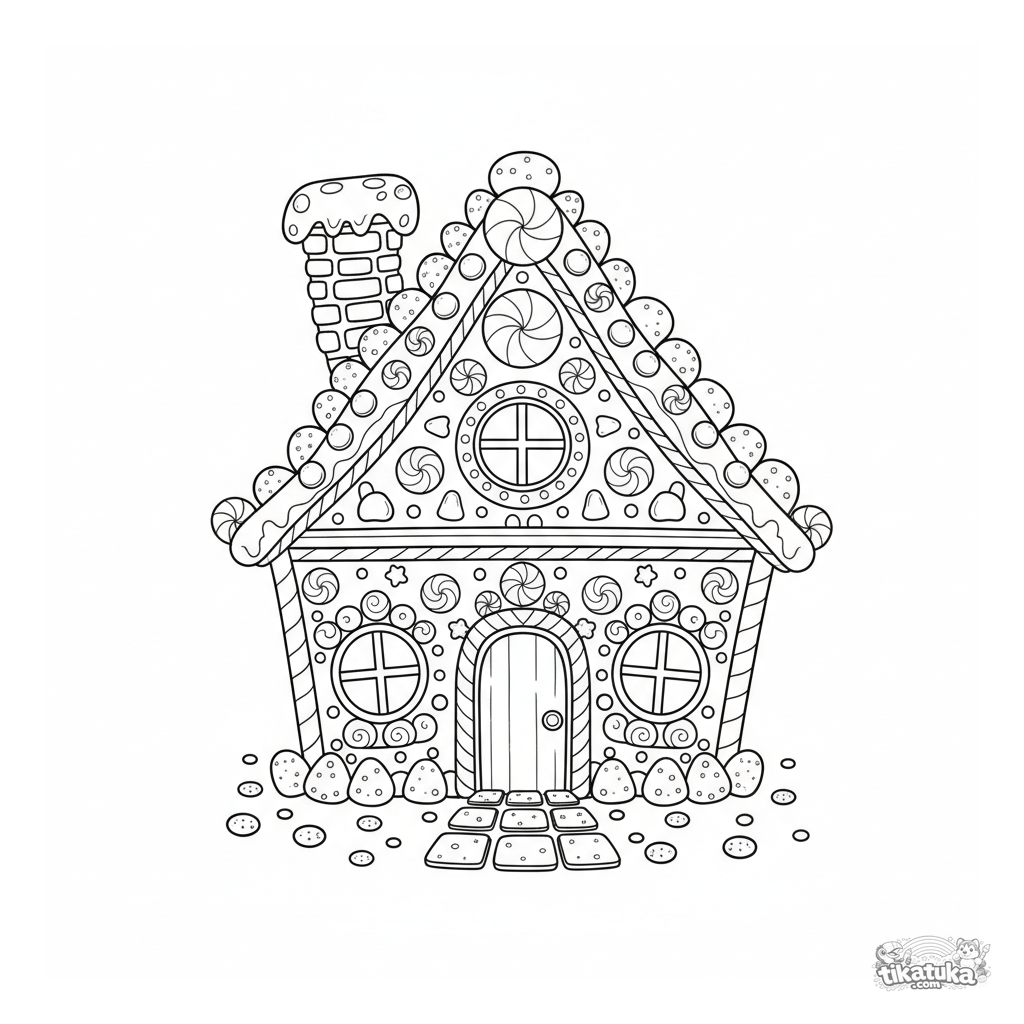 Сложная раскраска пряничного домика из сказки «Гензель и Гретель» для детей 8-12 лет. Множество деталей: конфеты, печенье, леденцы на крыше и стенах.