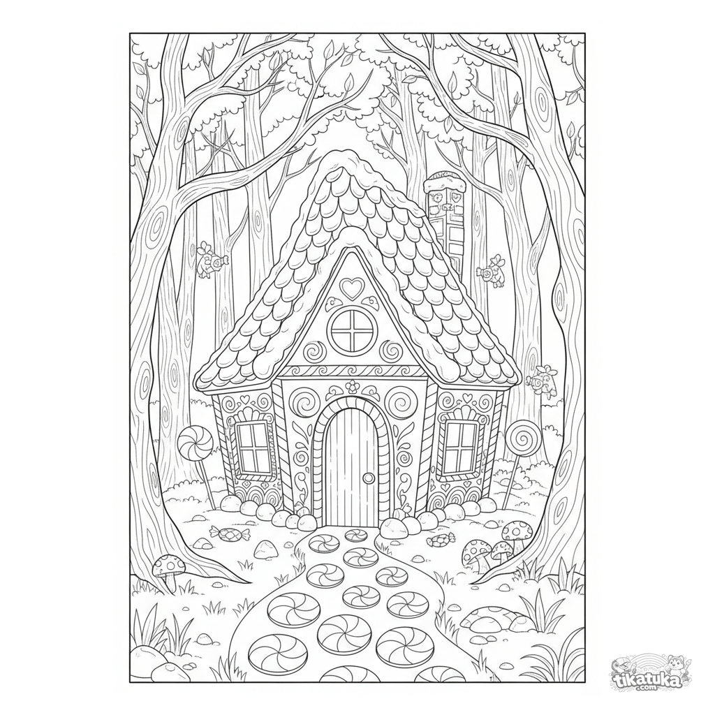Детализированная раскраска по сказке 'Гензель и Гретель' для детей 7-12 лет. Пряничный домик, скрытый в лесу, с конфетными украшениями.