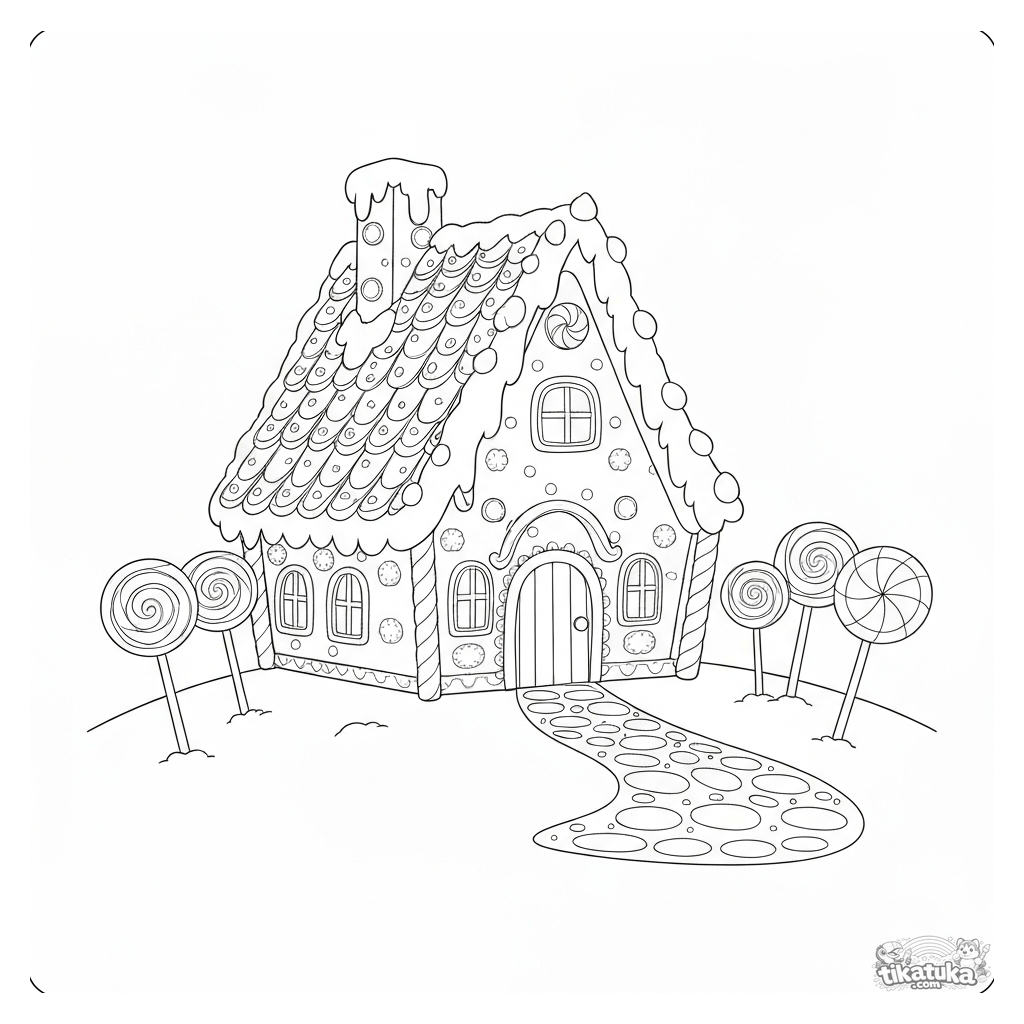 Раскраска по сказке: пряничный домик Гензель и Гретель. Дом из печенья и конфет с леденцовыми деревьями. Для детей 5-8 лет.