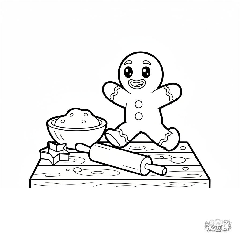 Простая раскраска для малышей: веселый пряничный человечек сбегает с кухни, перепрыгивая через скалку. Для детей 2-5 лет. Крупные простые формы, легко раскрашивать.