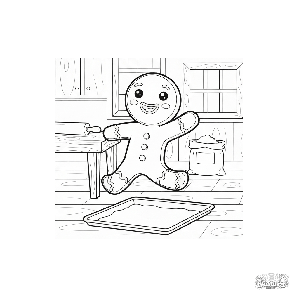 Простая раскраска для малышей 2-5 лет по сказке. Весёлый пряничный человечек прыгает с противня, чтобы сбежать, на фоне кухонной утвари.