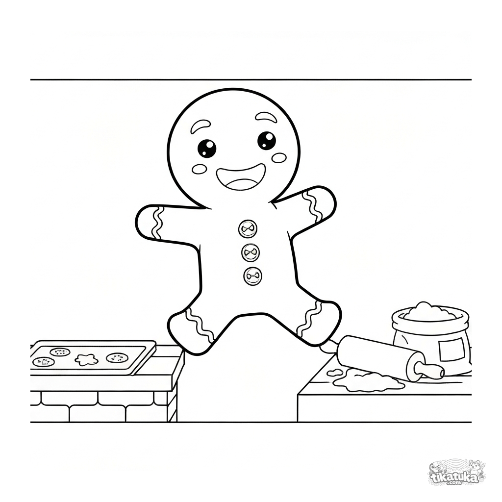 Раскраска по сказке: Пряничный человечек сбегает с противня из печи. Для малышей 2-5 лет. Простая сцена со скалкой и мукой на столе.