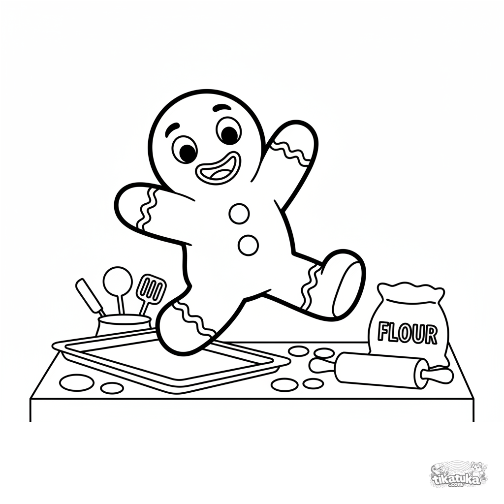 Раскраска для малышей: весёлый Пряничный человечек сбегает с противня на кухне. Крупные простые формы, для детей 2-4 лет.