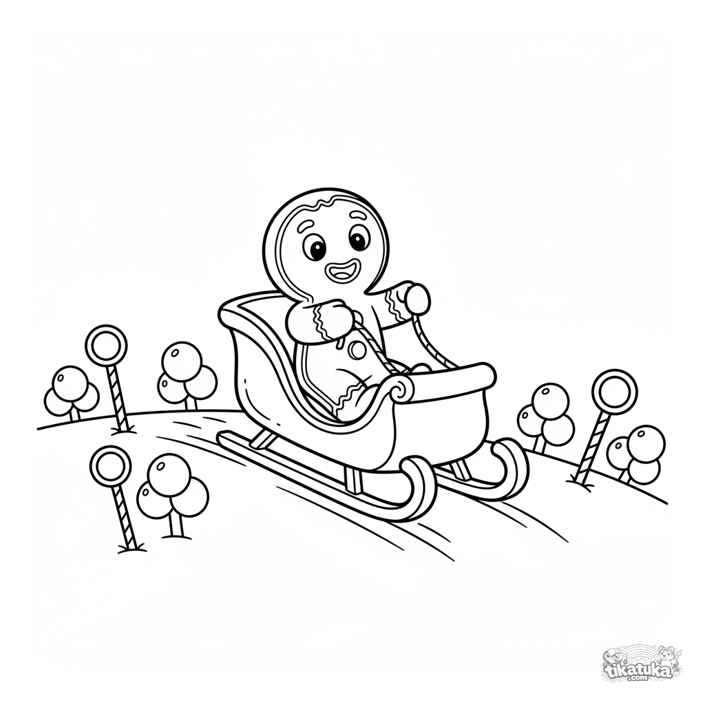 Простая раскраска для малышей 2-5 лет: весёлый пряничный человечек катается на санках из леденца с горки из глазури.