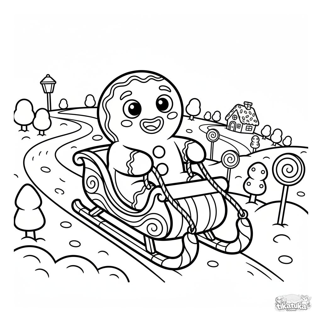 Раскраска для малышей 2-5 лет: весёлый пряничный человечек с глазками-глазурью катается на санях из леденца по снежному склону из белой глазури в сказочной стране сладостей.