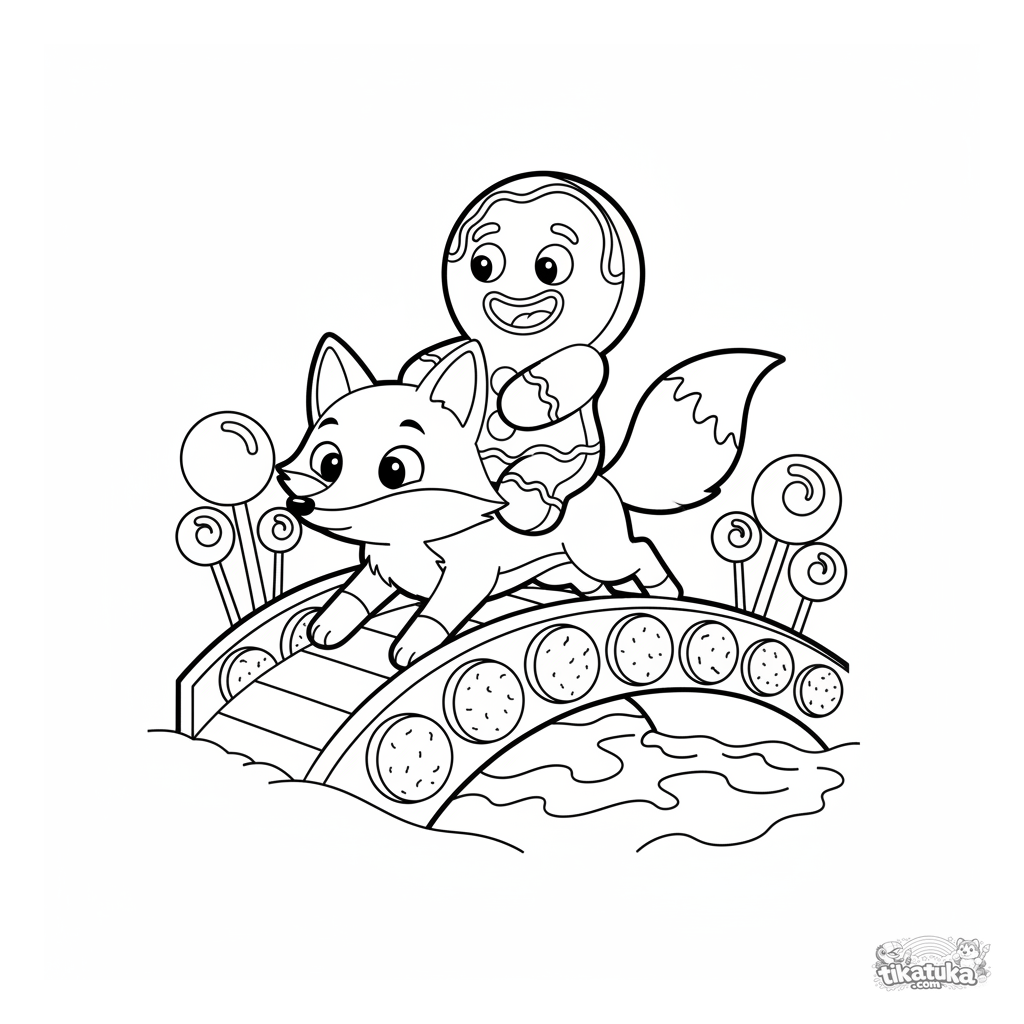 Раскраска: пряничный человечек скачет на лисе по мосту из шоколадной крошки через молочную реку. Для малышей 2-5 лет. Простая сказочная сцена из конфетной страны.