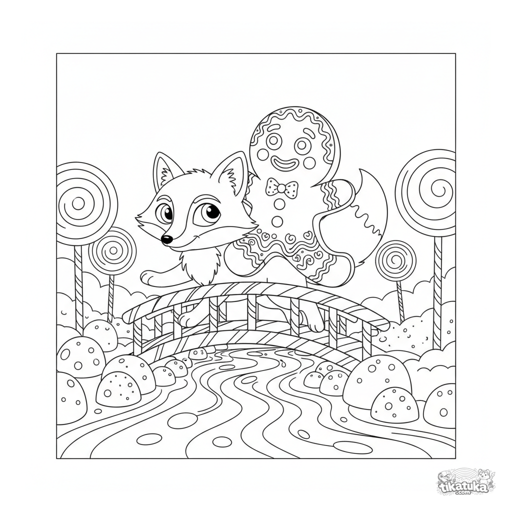Раскраска по сказке про пряничного человечка. Для детей 6-9 лет. Пряничный человечек верхом на лисе мчится по мосту из леденцов.