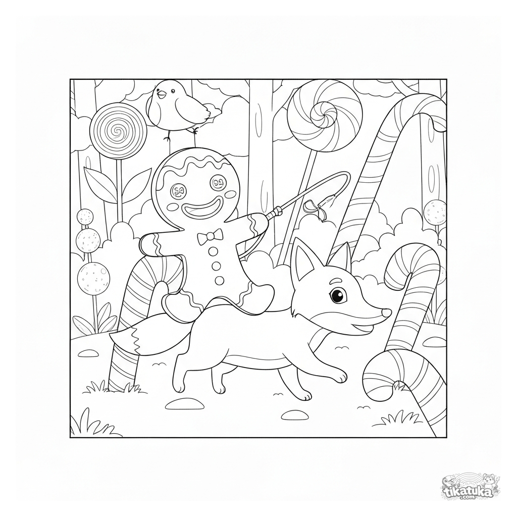 Раскраска по сказке: пряничный человечек скачет на лисе через волшебный лес из леденцов. Для детей 6-9 лет. Сладкая фантазийная сцена с множеством деталей.