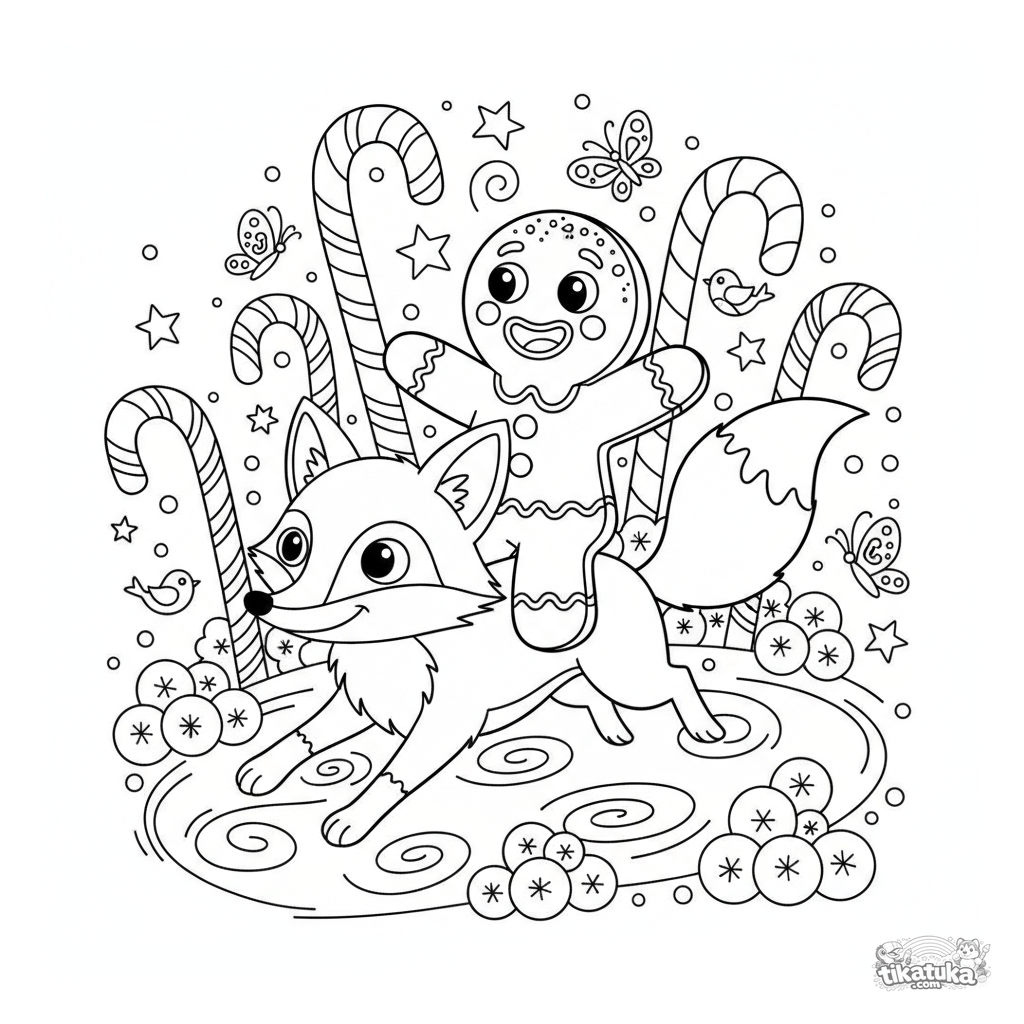 Раскраска по сказке: пряничный человечек скачет на лисе через лес из леденцов. Для детей 6-9 лет. Сладкая и волшебная сцена для раскрашивания.