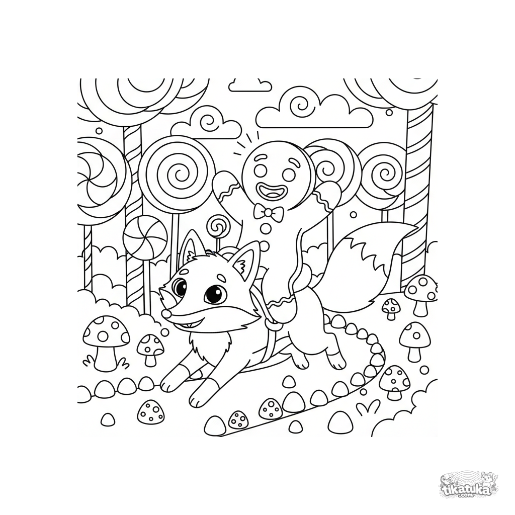 Раскраска по сказке: весёлый Пряничный человечек скачет на лисе через лес из леденцов и леденцовых палочек. Для детей 5-8 лет. Сцена с конфетными деталями.