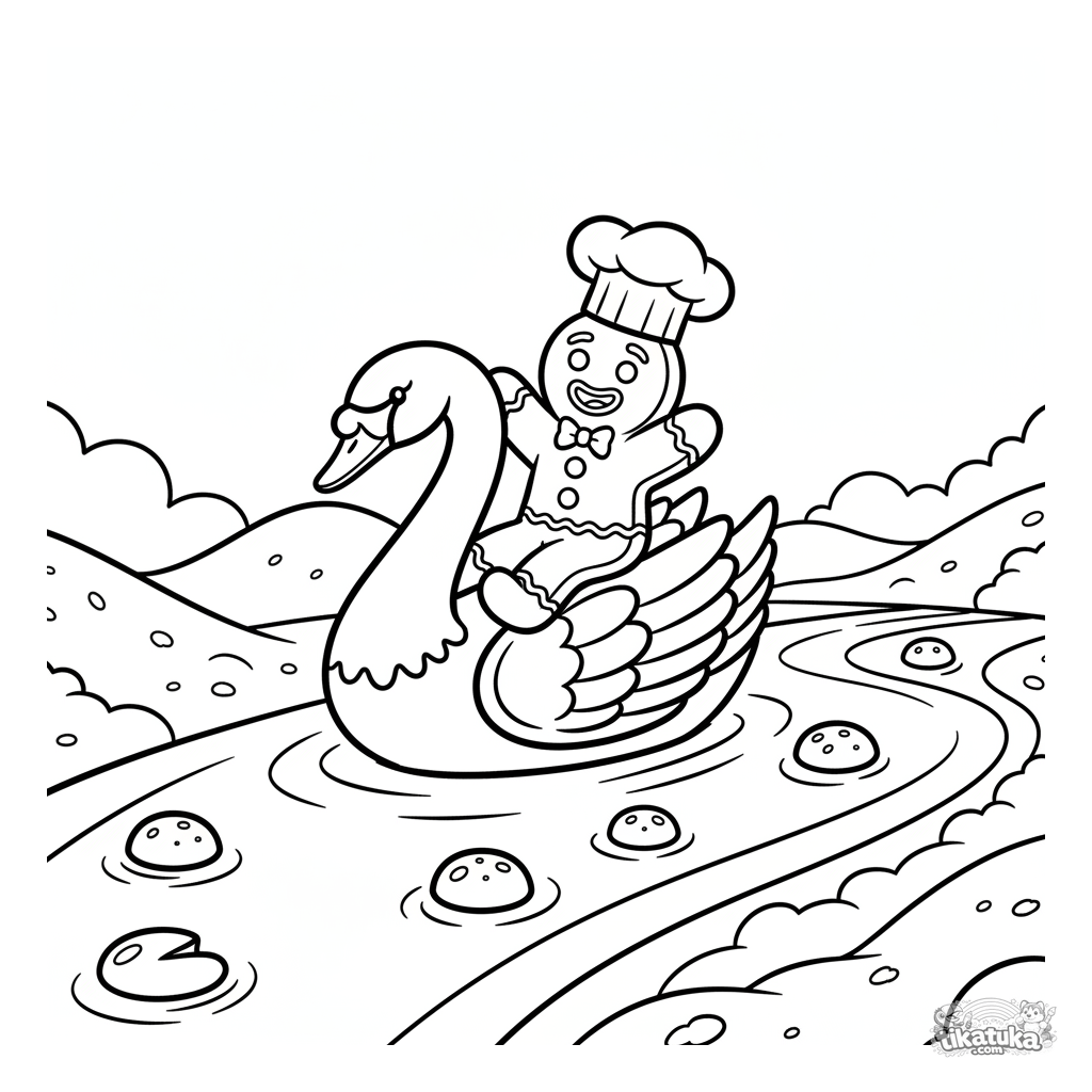 Раскраска с весёлым пряничным человечком, катающимся на лебеде из глазури по молочной реке. Для малышей 2-5 лет. Крупные простые формы.