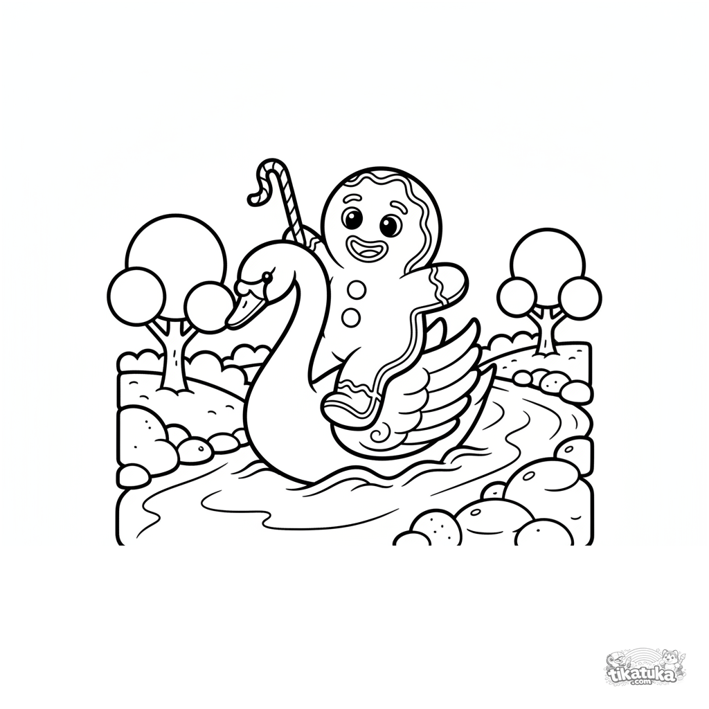 Простая раскраска для малышей: пряничный человечек катается на лебеде из глазури по молочной реке. Для детей 2-5 лет. Конфетные деревья и печенье-камни.