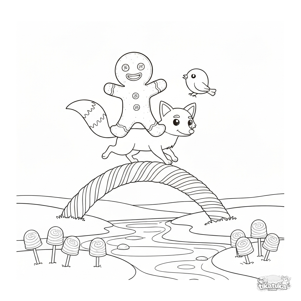 Раскраска по сказке: пряничный человечек скачет на лисе по мосту из леденцов. Для детей 6-9 лет. Сцена с рекой из шоколадного молока и мармеладными кустами.