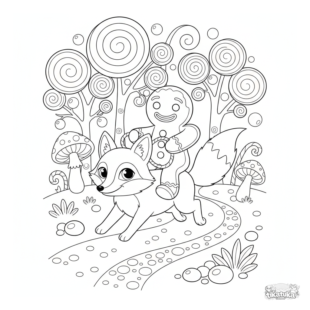 Раскраска по сказке: пряничный человечек скачет на лисе через волшебный конфетный лес. Для детей 5-8 лет. Сладкая и весёлая сцена.
