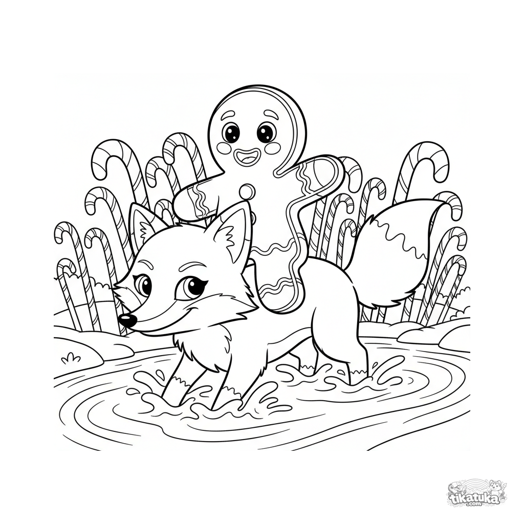 Раскраска по сказке: Пряничный человечек едет на лисе через молочную реку. Для детей 6-9 лет. Человечек держится за шерсть лисы, на берегу растут тростники из леденцов.