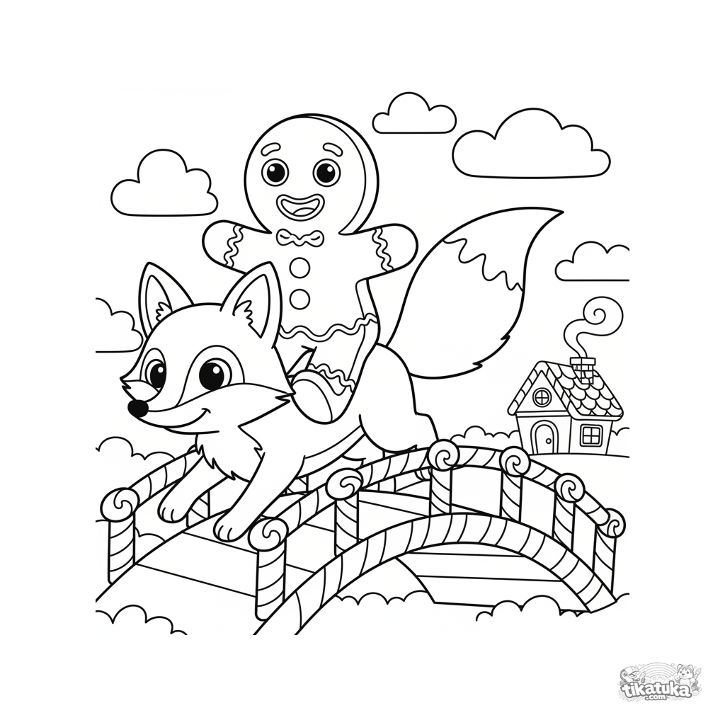 Простая раскраска по сказке: пряничный человечек скачет на лисе через мост из леденцов. Для малышей 2-5 лет. Крупные детали, толстые контуры.