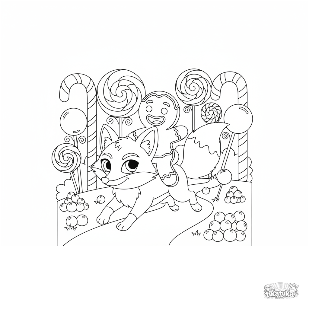 Раскраска: пряничный человечек из сказки скачет на лисе через леденецовый лес. Для детей 5-8 лет. Веселая и детализированная сцена.