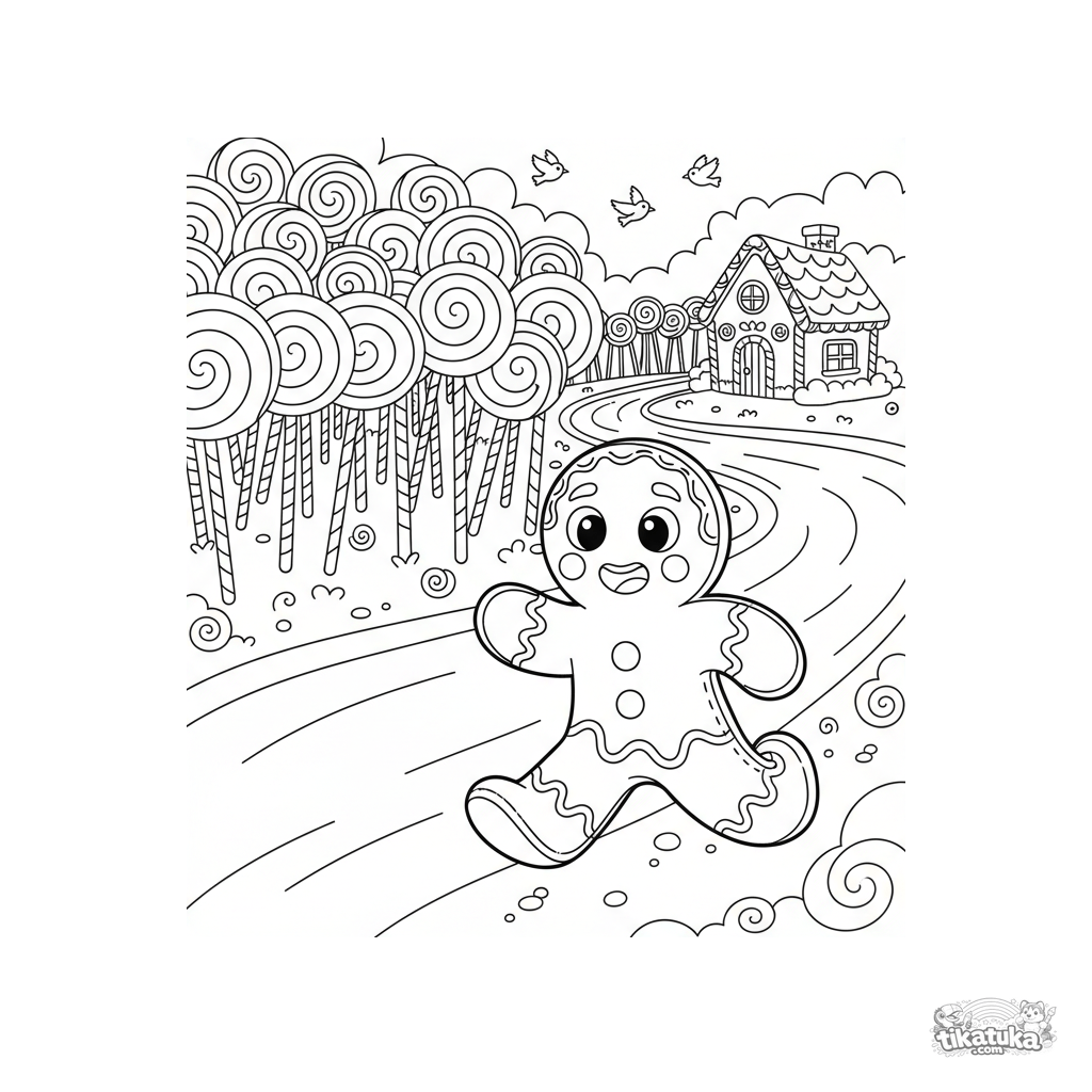 Раскраска по сказке: Пряничный человечек в панике бежит к молочной реке, за которой виден волшебный конфетный лес. Детализированная сцена для детей 7-12 лет.