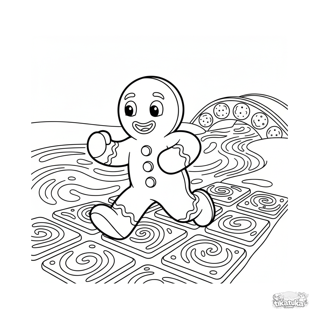 Простая раскраска для малышей 2-3 лет: весёлый Пряничный человечек убегает по дорожке к молочной реке. Крупные простые формы, идеально для самых маленьких.