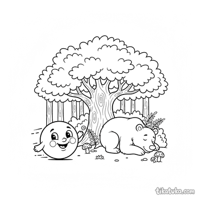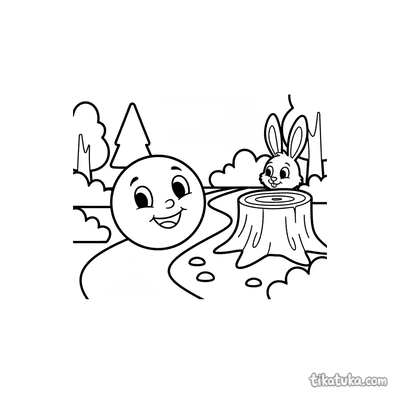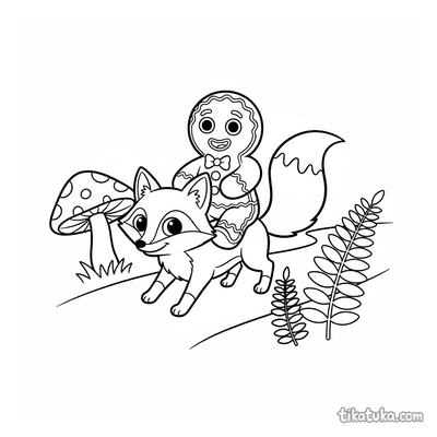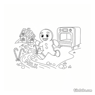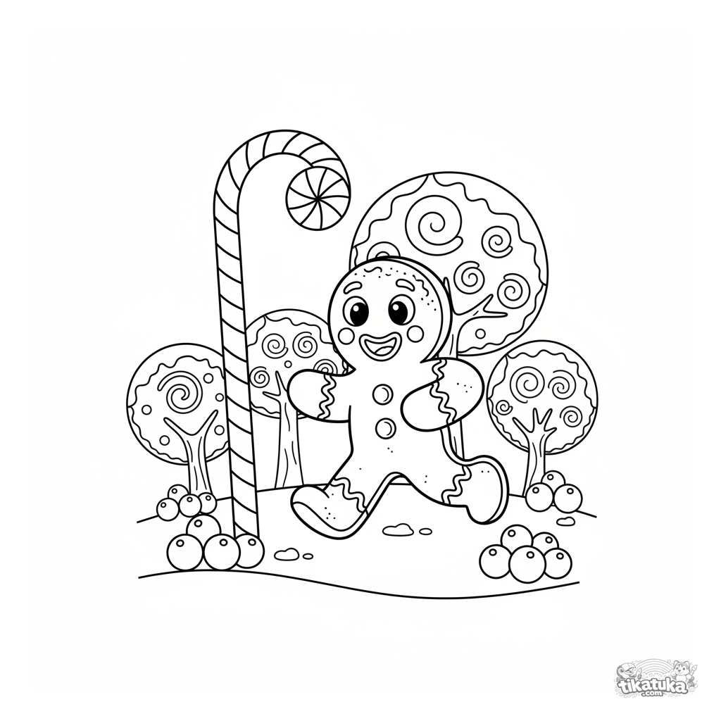 Раскраска для детей 4-6 лет по сказке: Пряничный человечек бежит по лесу из печенья. Весёлая и узнаваемая сцена с простыми сладкими деталями.