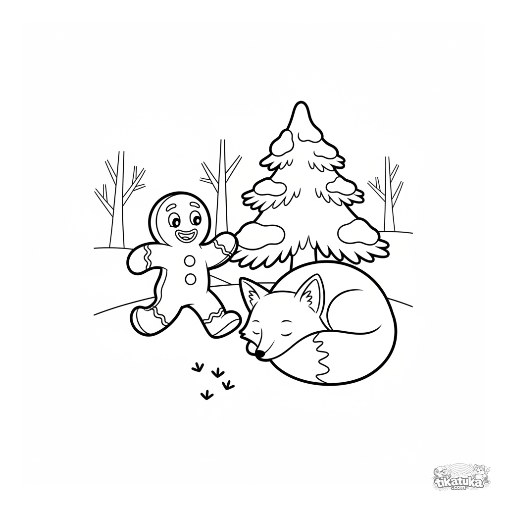 Раскраска по сказке для детей 4-6 лет: весёлый Пряничный человечек убегает мимо спящей лисы в заснеженном лесу. Зимняя, динамичная и узнаваемая сцена.