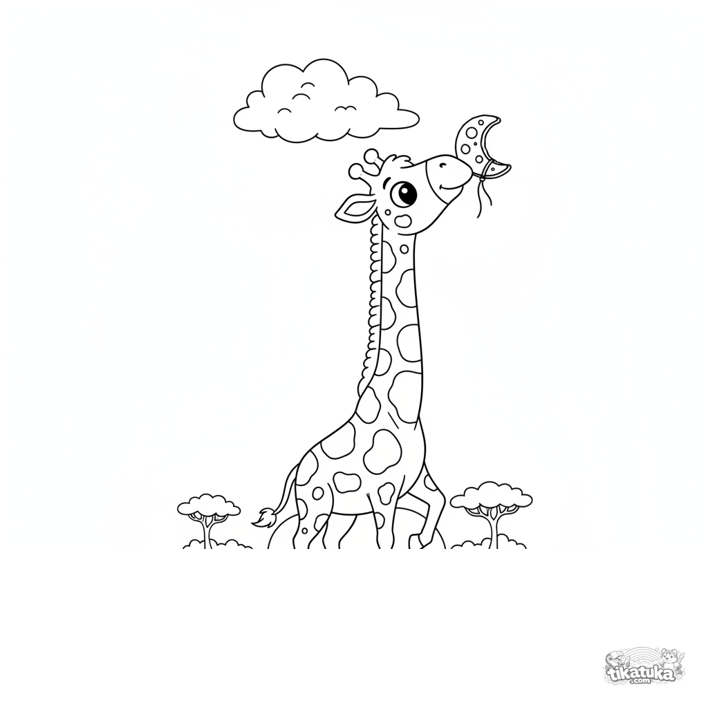Раскраска для детей 4-6 лет: любопытный жираф с пятнышками-горошком тянется к висящему печенью в форме луны на фоне саванны. Простые формы, умеренная детализация.