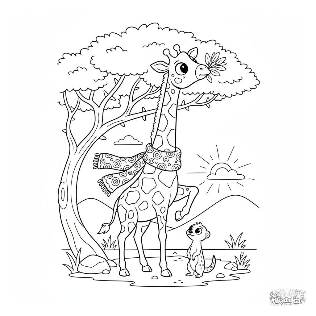 Раскраска для детей 4-6 лет: жираф в шарфе тянется к листьям акации на фоне саванны. Милый сурикат наблюдает за ним. Простые формы, подходит для начинающих.