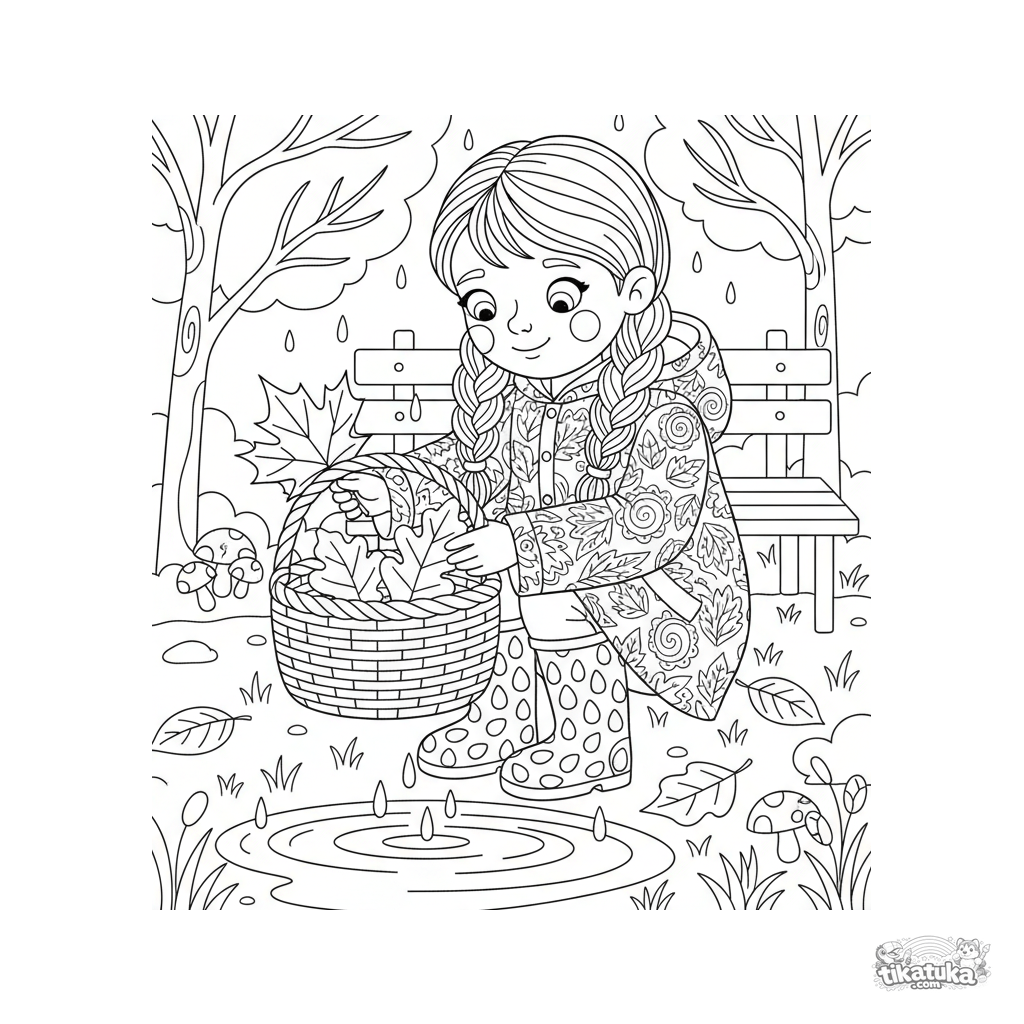 Раскраска для детей 4-6 лет: девочка в сапогах и дождевике собирает разноцветные осенние листья в корзину под дождём в парке. Чёткие формы, сбалансированные детали.