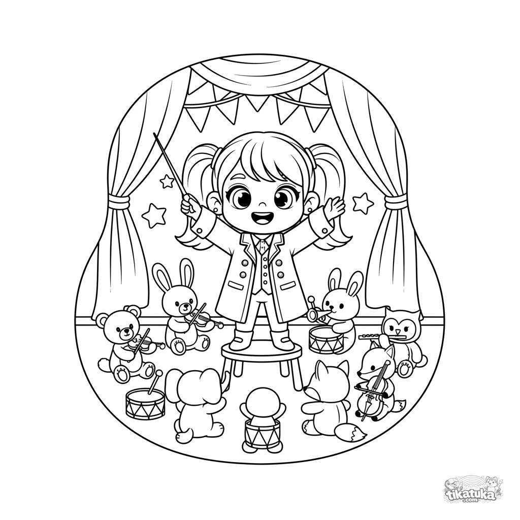 Раскраска для детей 7-9 лет: девочка дирижирует игрушечным оркестром из плюшевых зверюшек в праздничном зале. Весёлая сцена с воображаемыми музыкантами.