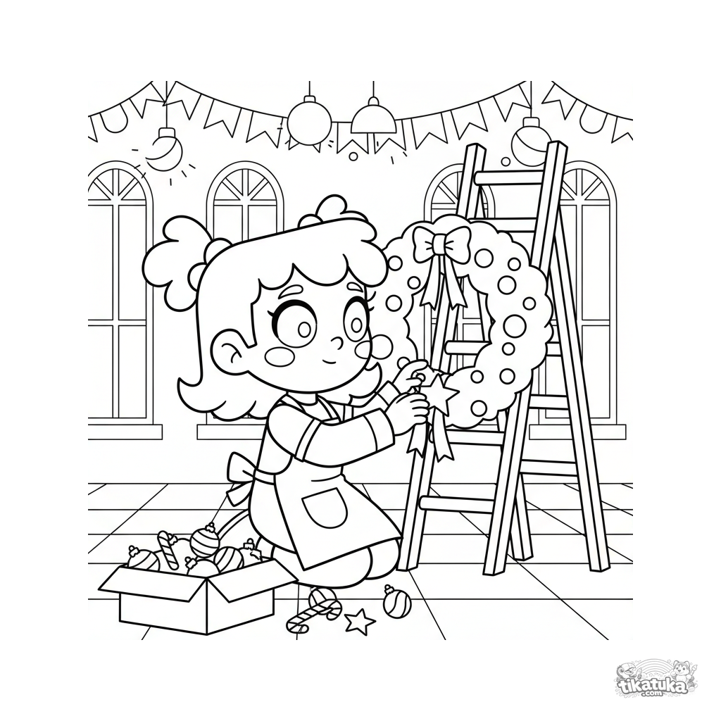 Раскраска для детей 7-9 лет: девочка украшает большой праздничный венок в зале. Динамичная поза, несколько предметов для раскрашивания.
