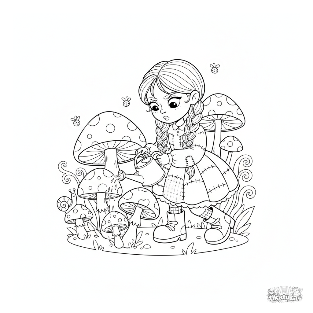 Раскраска с девочкой в лоскутном платье, которая поливает волшебные гигантские грибы. Для детей 5-8 лет. Средняя сложность, много деталей для раскрашивания.
