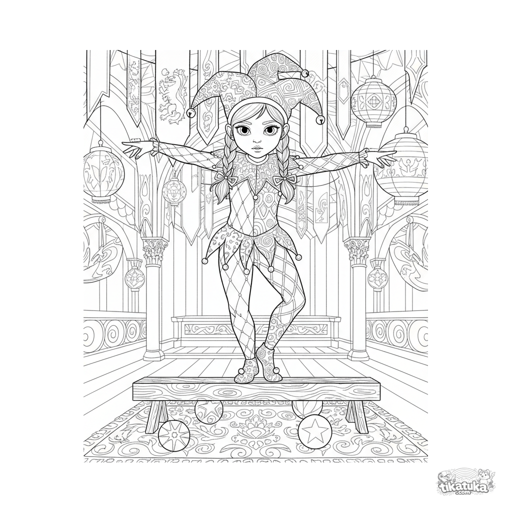 Раскраска для детей 10-12 лет: девочка в костюме шута балансирует на бревне в праздничном зале. Детализированная сцена с элементами циркового представления.