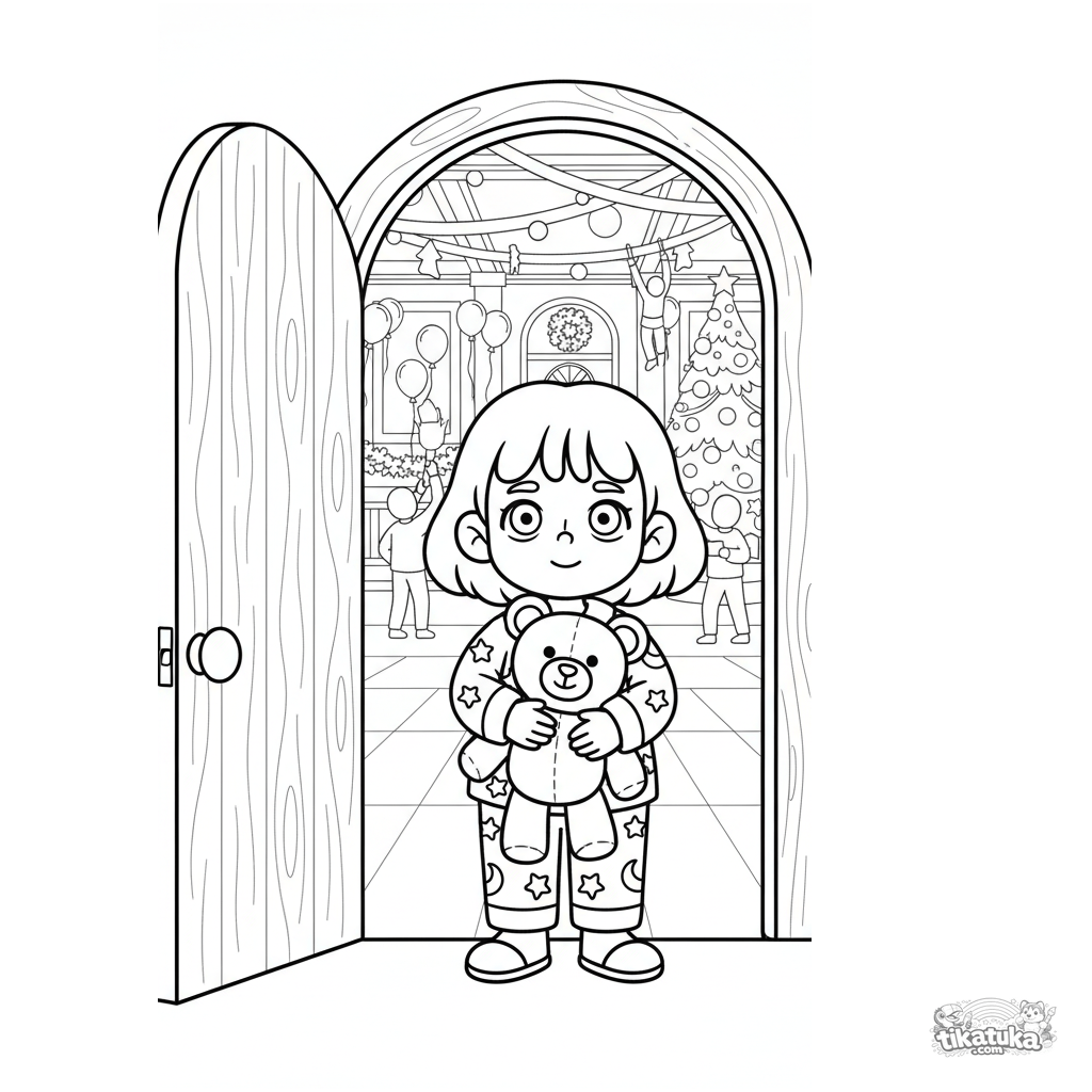 Раскраска для детей 7-9 лет: девочка в пижаме с игрушкой смотрит, как украшают праздничный зал. Теплая сцена, полная фигура в дверном проеме.